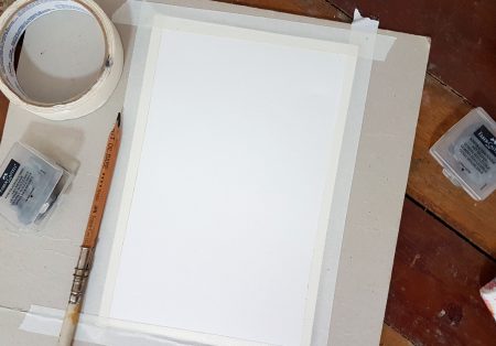 Vamos primeiro arrumar o espaço ! vamos colocar fita crepe em volta das laterais do papel para fixa-lo melhor e para quando molharmos, não termos problemas de “ ondas “ indesejadas …