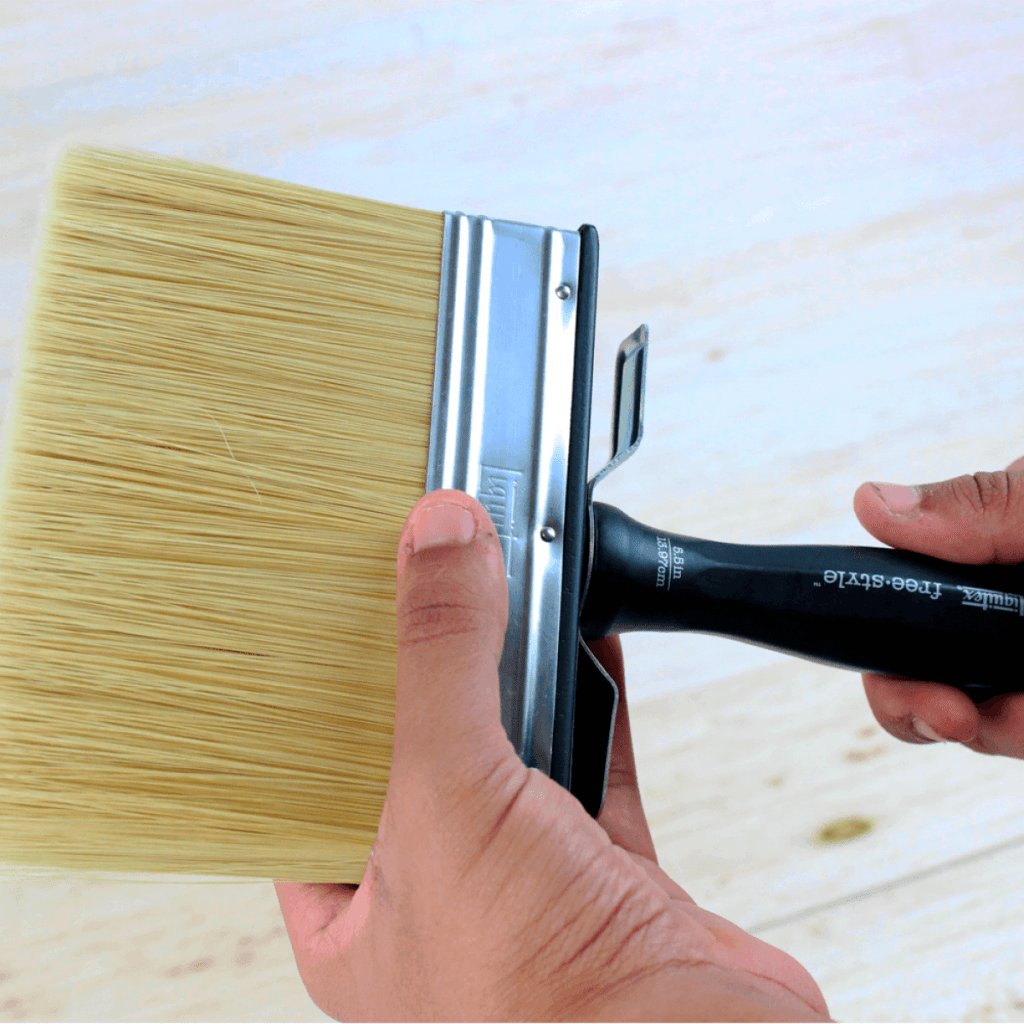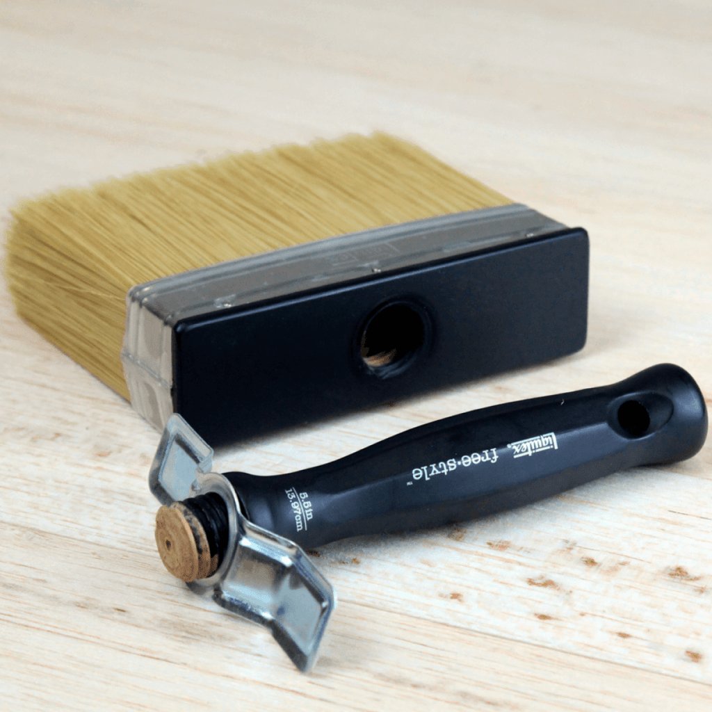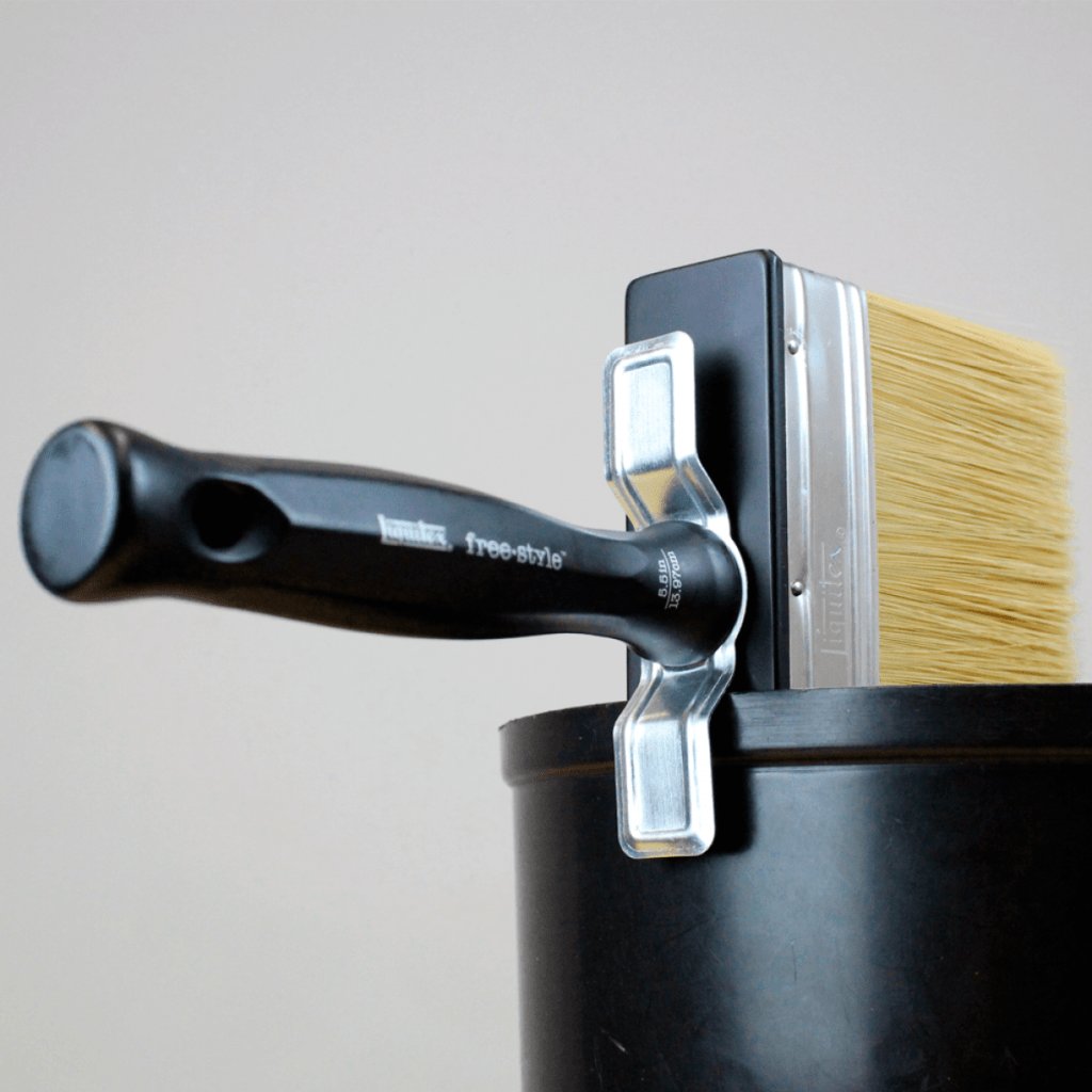 Sua alça pode ser retirada para anexar uma haste maior e assim alcançar áreas de difícil acesso. Um gancho de metal em sua base permite que esta trincha seja anexada na lateral da lata de tinta.